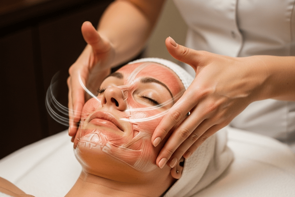 Podczas masażu terapeuta pracuje z 20 płaskimi mięśniami szkieletowymi twarzy, w tym z mięśniem czołowym odpowiedzialnym za poziome zmarszczki, mięśniem okrężnym oka kontrolującym "kurze łapki", czy mięśniem żwaczem często napięta przez stres i bruksizm. Ta precyzyjna praca anatomiczna sprawia, że kobido daje efekty niedostępne dla zwykłych masaży.